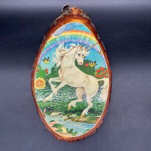 Vintage Unicorn Rainbow Wall Hanging Decor 70s Live Edge Wood Missouri Souvenir