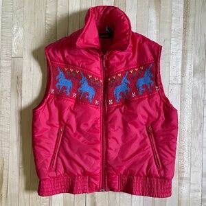 Vintage puffy vest with unicorn sweater detail across the front chest. This vest has zipper closure on body as well as pockets. Some paint chipping on pocket zippers. See photos for details. Marked as size medium. Please see measurements for most accurate fit as vintage sizes can be different from modern sizes.