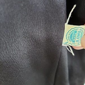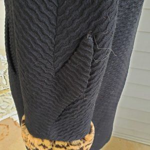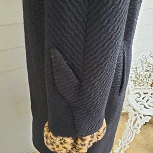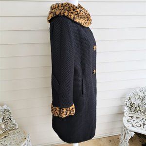 Adorable textured black wool coat by unknown maker. There is a blue union label but no other tags still in it. It is fully lined with silk. Fur is faux and has a leopard print. I was told by an expert that this coat was top quality. It was sold by a furrier. Notice the hooks are specific to furrier use. Size is probably a 6 or smaller please check measurements.