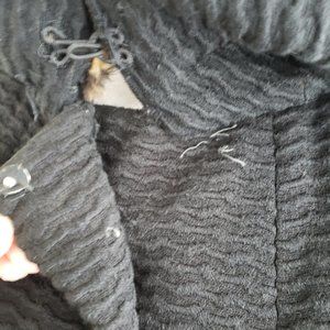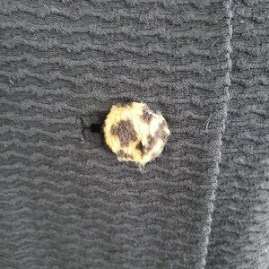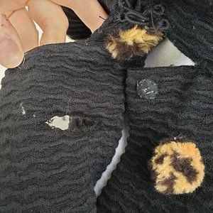 Condition: Coat is in nice condition with some minor issues. I think there used to be a pair of snaps at the very top near the neck. There are only 2 and they are the miss-matched ones. You don't even have to use snaps if you don't want. It looks like they were to make the collar fit snug around the neck. Also, there are these decoration things on each sleeve of the coat. One of them has a few threads unraveled. About an inch of the thread has come out under the right arm too. See last 3 pictures for the issues.