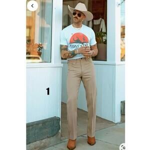 Crafted from structured wool felt in a warm sand beige, with a classic cowboy crown and a 3” brim that brings the drama. Finished with a woven band and a single feather at the brim—just enough flair to make ‘em look twice. Inner circumference ~23” (Size Large / 7 3/8), crown height ~5.5”.