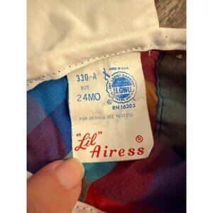 Step back in time with this delightful vintage Lil Airess long-sleeved dress for toddlers. Featuring a colorful plaid pattern, a crisp white Peter Pan collar, and button-accented bodice, this piece evokes charm and elegance. Made in the USA from a cotton-polyester blend, this dress is a cheerful nod to nostalgic style.