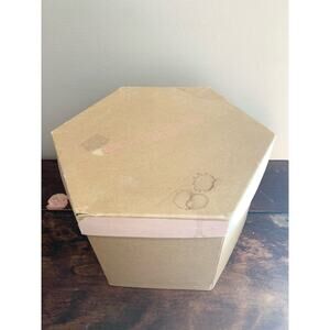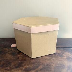Details: woven straw hat with brim. mesh overlay and ribbon detail. original octagon hat box from Schuster's Milwaukee Wisconsin.
