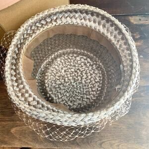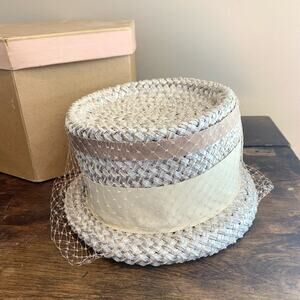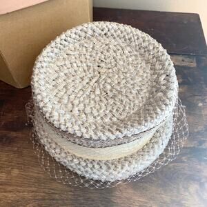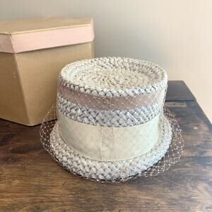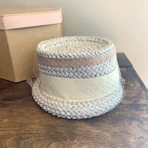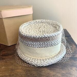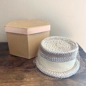 Vintage Union Made Woven Straw brimmed hat Mesh Ribbon detail original hat box
