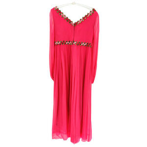 Step into a world of enchantment with our Vintage Union Tag Pink Green Layered Chiffon Dress. This ethereal piece features floral trim, an empire waist, and illusion long sleeves—a perfect embodiment of fairycore elegance. Whether you're attending a cocktail party or a ballroom affair, this vintage dress is crafted to make a statement. Elevate your wardrobe with this unique gem, designed to transport you to a realm of ethereal beauty and enchanting style, capturing the spirit of vintage allure.