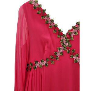 Vintage Union Tag Pink Green Layered Chiffon Floral Trim Empire Waist Etherial Fairycore Illusion Long Sleeve Cocktail Ballroom Dress
