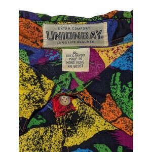 Bright, bold and beautiful. Cool vintage Unionbay shirt that screams 90s. Features a mottled all over flower print in orange, red, purple, yellow, and teal.