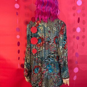 This vintage late 1980s Diane Freis kimono jacket is pure wearable art. Intricately embroidered with metallic threads, sequins, and beads in bold red, turquoise, and gold, it’s a show-stopping piece that feels like stepping into a kaleidoscope.