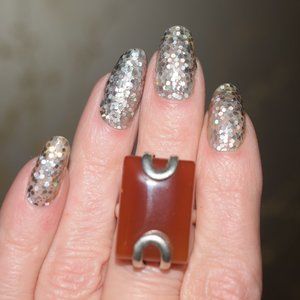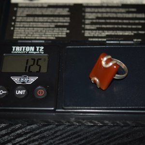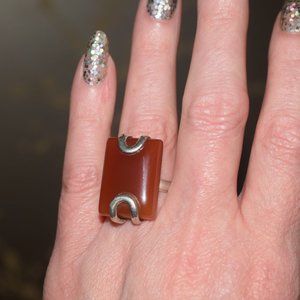 Hello, welcome to my listing. Up for sale is this vintage art deco ring. It is sterling silver marked 925. It has a very large genuine 25mm. by 18mm. Carnelian stone. In a unique modern age, free style setting. It weighs in at 25.5 grams, all in a size 9. It is in very good condition. No dings or scratches on the stone. This ring will get noticed. very unique. If you have any questions, please feel free to ask. Thank you and have a wonderful day.