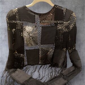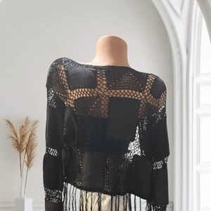Vintage Unique Black Crochet faux leather fringe Western Cardigan