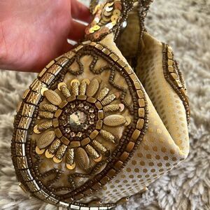 GUC with no rips or stains. Gold tone heavily embellished fortune cookie style evening handbag with sequins and beading throughout. Functional magnetic closure and intact heavy beading. No brand or fabric content tags. Small hand bag for those essentials only on a day or night out.