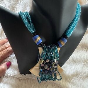 Vintage Unique Multi Strand Sea Beads Necklace w/Mother of Pearl Pendant