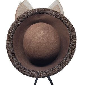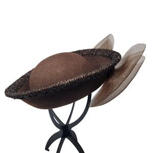 Vintage Unique Rare Wool Church Hat Bumper Halo Brown Netted Bow Chocolate