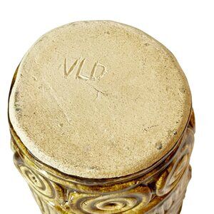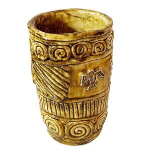 This vintage studio pottery vase features a unique fish and eagle design, adorned with a rich brown glaze. It is signed by the artist, making it a collector's item and a perfect addition to any home decor. Could make a neat utensil holder.