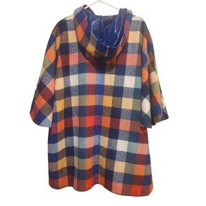 This reversible poncho features a plaid virgin wool exterior and waterproof nylon interior. Designed for practicality and style, the hood and drawstring closure enhance functionality.