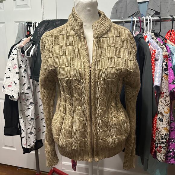 Vintage Unisex Tan Chunky Cable Knit Zip Sweater Jacket Acrylic Medium