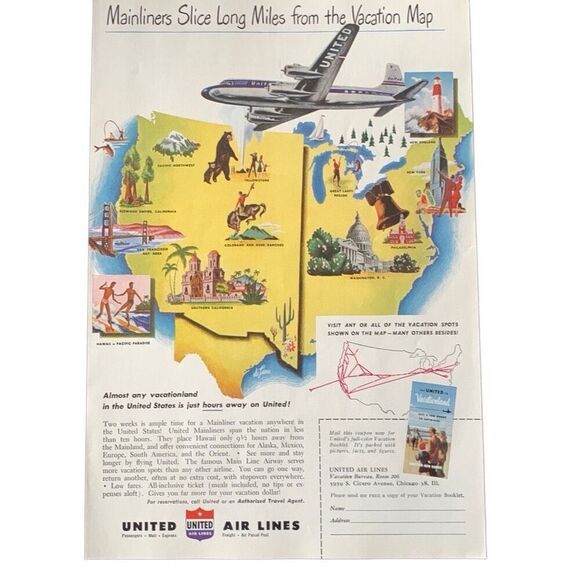 Vintage United Air Lines Vacation Map Ad Advertisement
