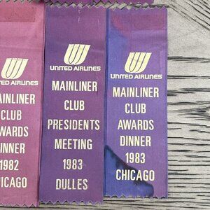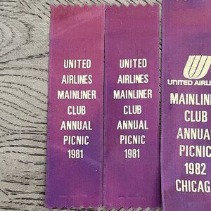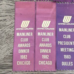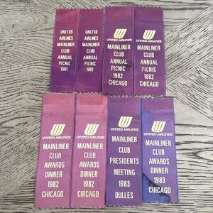 Vintage Set of 8 United Airlines Event Badge Ribbons for the Early 1980's. Unique set from various events such a the 1980 Mainline Club Annual Picnic, Mainliner Club Awards Dinner Chicago 1982 and 1983, Mainliner Club Annual Picnic 1982 and Mainliner Club Presidents Meeting Dulles 1983. They are all different shades of purple, has the United Double U logo and has metallic gold lettering.