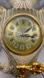 The clock features a detailed ornate design with a distressed ivory finish, gold tone bezel, domed glass lens, and decorative pendulum style accent. It is made for AC electric operation only and uses a 115 volt, 60 cycle, 2 watt motor. The original manufacturer label is on the back, clearly marked Model No. 706.