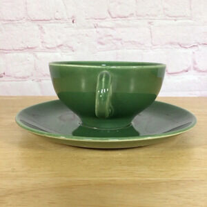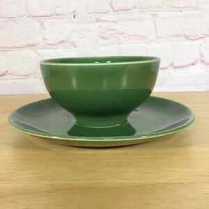 Vintage Universal Ballerina oven-proof green cup and saucer set. This set was Union made in the USA. The saucer measures approximately 6 1/4” in diameter. The cup measures approximately 2 1/4” tall, 5” wide including the handle. Great vintage condition. No chips or cracks. There are a few light surface scratches as shown in the photos. Smoke free home.
