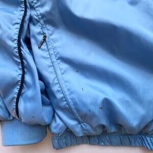 • This is a preloved jacket in good condition, with some spots, marks, and areas of yellowing, discoloration, small pulls, and a spot where it looks like the zipper caught the inside of the jacket. See photos for best detail.