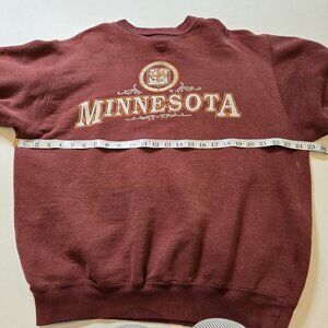 The Vintage University of Minnesota Golden Gophers Sweatshirt is a men's large-sized pullover featuring a crew neck and relaxed fit. Made from a blend of polyester and cotton, this burgundy marroon and gold sweatshirt is machine washable and perfect for all seasons. The graphic print of the iconic Regents of the University of Minnesota Golden Gophers adds a nostalgic touch to this classic piece of activewear, making it a stylish and comfortable option for any fan or collector. There is some wear and a hole on the sweatshirt. Please see photos for details and measurements. Fast shipping and smoke-free home.