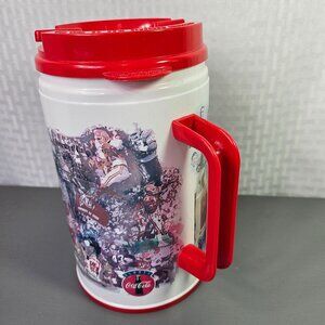 This vintage University of Utah football travel mug, adorned with a vivid collage of historical football moments, boasts a sturdy red lid and handle. Its generous size ensures you can carry your favorite beverage while celebrating the rich heritage of Utah football. A collector's gem for any fan.