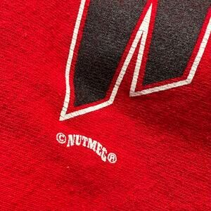 • Vintage 90s University of Wisconsin Badgers College School Pullover Crewneck Sweatshirt in red with big embroidered block letter black spellout on the front with Nutmeg logo hit below. Quality thick sweatshirt. Made in the USA.