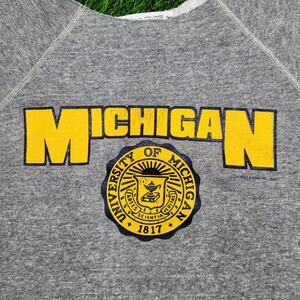 80s University of Michigan gray boxy sweatshirt with bold seal print and raw edge collar in soft cotton blend