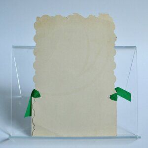 No writing. Some slight damage (bend mark on the upper right corner). I do not know if this is the full original card or if part is missing but it's still beautiful as is and would look great framed!