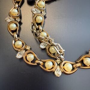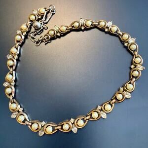 Vintage Unsigned Faux Pearl Rhinestone Collar Gold Necklace
