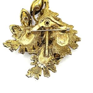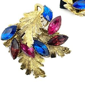 Vintage unsigned textured gold tone with deep ocean blue, deep fuchsia and purple rhinestone pin brooch clip-on earrings set. All stones are present. Finish is in good condition with minor wear on the back of the brooch. Pre-owned.