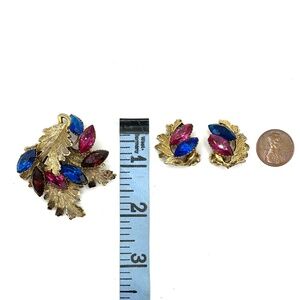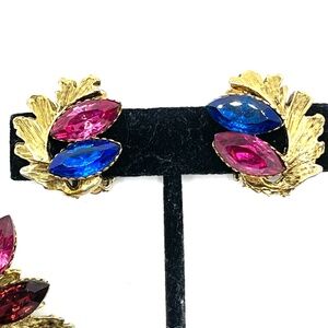 Vintage Unsigned Gold Tone Blue Fuchsia Purple Brooch Clip Earrings Set
