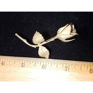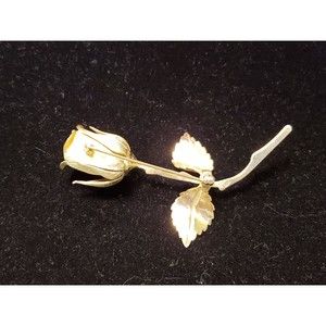 Vintage rose floral brooch is a classic, timeless piece. This flower pin features a gold tone rose with stem and leaves. Although unsigned, this is an EXCELLENT example of high quality costume jewelry. Perfect for the collector or as a chic statement piece! The piece is 1 1/2" wide and 2 5/8" long. The brooch is in excellent vintage condition - no cracks or scratches. The clasp works and it feels solid.