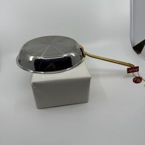 BEAUTIFUL NEW SPRING GOLDSTAR GL 84 85 Saute Pan with gold-plated brass handle. This is a gorgeous pan made in Switzerland by Spring, well known for making some of the finest cookware in the world. Bought this on my honeymoon in Switzerland late 1970's. It is a beautiful combination of stainless steel (INOX) and brass to make smooth transition from oven or stovetop to table. The secret and essence of this technology is the low need for water when using Goldstar-GL cookware, which can leach vitamins and minerals from the food you cook. .It measures 15 1/2" long to handle, and 9" diameter top. The pan is 1 7/8"" deep. This is a new pan, but does have a few light scratches and finger prints/slight discoloration from age that will most likely will diminish with polishing. Ive never seen the line in the USA. Its a beautiful pan.