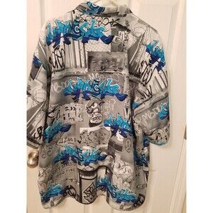 vintage Up Rock button-up shirt for men in size 2XL. It features a graphic print with an all-over graffiti design in multicolor. Length: 32 inches Chest: 27 inches