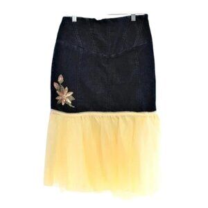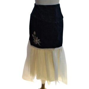 Vintage Upcycle Blue Jean & Tulle Ruffle Skirt Sequin Flower Embellished
