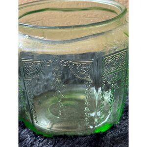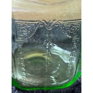 This vintage green depression glass jar features an eye-catching octagonal shape with an intricate embossed design.
