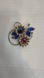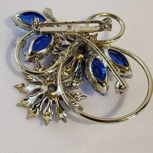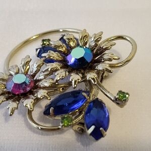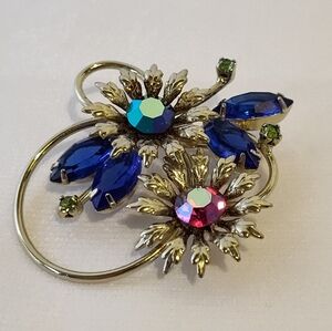 This Vintage Uranium Flower Brooch features a marquise-shaped simulated blue rhinestone as the main stone, set in yellow gold plated metal. The brooch also includes uranium glass secondary stones in a multicolor design, with a vintage appeal. Handmade in the United States, this original piece is perfect for all occasions and would make a unique and eye-catching addition to any fashion jewelry collection.