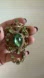 Vintage Czech Victorian Revival Brooch-Pendant with Green Uranium Glass Rhinestones – Circa 1940s–1950s The piece features an ornate brass filigree frame with Rococo-inspired scrolling and delicate pierced work. At its center is an oval-cut green glass stone, surrounded by numerous peridot-colored uranium glass rhinestones. Under UV light, several of these smaller stones, (the three teardrop shaped stones see picture) glow a bright neon green, a hallmark of authentic uranium glass from this era. The brooch is fitted with a rollover safety clasp and a hidden bail, allowing it to be worn as either a brooch or a pendant. This versatile design was common in mid-century Czech costume jewelry intended for export. Condition: Excellent vintage condition with light age-appropriate patina, secure stones although one is missing at the 3pm mark, pictured , and fully functional clasp. Very charming with the bottom piece dangling, reticulated. Estimated Era: 1940s-1950s Origin: Czechoslovakia (Gablonz region) Materials: Gilded brass, uranium glass rhinestones Goldtone Brass look Style: Victorian Revival / Rococo Revival Measures 2.5” x 1.5”