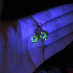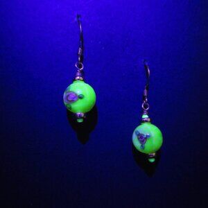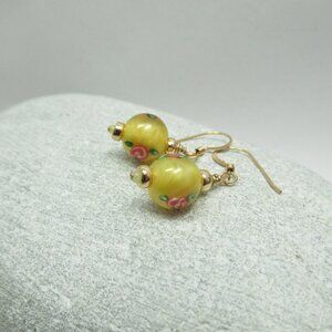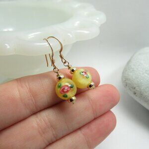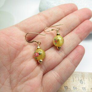 This listing is for the vintage Czech lampwork glass bead earrings pictured. These earrings are new and have never been worn. They were made by me using 14k gold filled sterling earwires and findings with vintage round lampwork Czech Uranium glass beads. The flower pattern is visible on two sides of each bead. These beads feature a beautiful inner iridescence, or chatoyancy, reminiscent of Tiger Eye with a nice golden yellow tone. They glow under blacklight due to the Uranium used in coloring and making the glass.