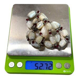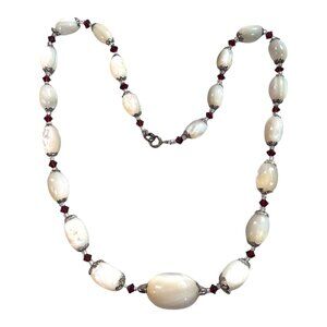 Elevate your style with this elegant vintage necklace, featuring cream and red beads with silver accents. Its timeless design complements a range of outfits.