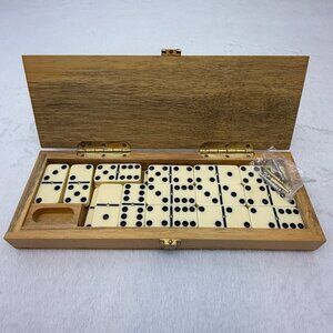 Vintage Item. Good condition for its age. 100% Playable and Complete unless otherwise noted. (Outside of wood box has some discoloration and scuffing, but dominoes and cribbage spinners are brand new. Outside box has cosmetic damage which may include rips, tears, creases, tape, dust, writing, etc. See photos.)