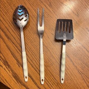 Set of three vintage utensils featuring blue floral handles. Includes a slotted spoon, fork, and spatula.