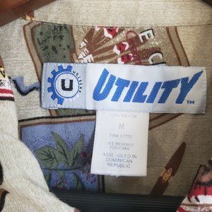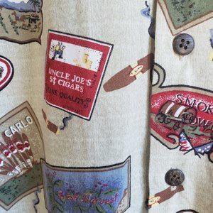 Vintage Utility Mens Cigar Lounge Button Down Short Sleeve Shirt Size MediumGood pre-owned condition. No visible flaws. Observe photos well for details.Features front pocket, slits on botton sides, illustrations of Fresh Harvest, Smoke'em Cowboy, Mount Fuji, Monte Carlo, etcMachine wash cold, non-chlorine bleach only, tumble dry low, medium ironItems are carefully inspected to the best of my ability.Please note, item measurements are approximate and in the photos.Previous washings may change the sizing.Please compare my measurement photos to your favorite garments to ensure fit.I store my items in a pet and smoke free home.I ship quickly and welcome all questions and offers.If you would like to order more than one item, send me an offer so I can do combined shipping & save.
