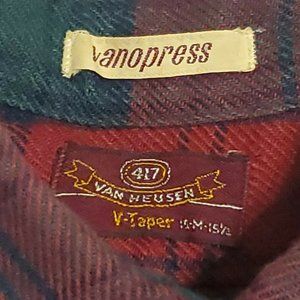 Vintage VAN HEUSEN Vanopress Wool Flannel Loop Collar Red Green Plaid Shirt Sz M
