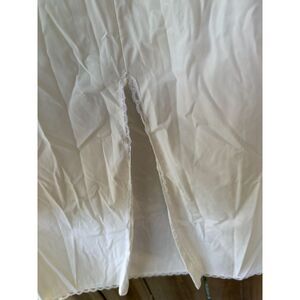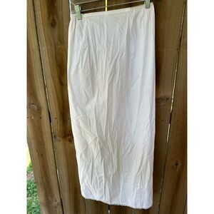Vintage Vassarette maxi half slip with 3/4 elastic waistband with pillowtabs at each end of the elastic, lace trim hem, front walking slit. Color is white with JUST a hint of pink.