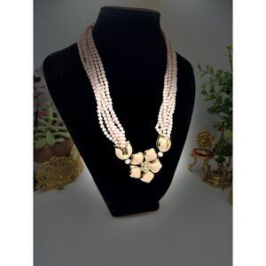 Add a touch of vintage elegance to your collection with this stunning pink beaded statement necklace. Features multi-strand pastel pink beads and a bold gold tone enamel flower pendant adorned with clear rhinestones for extra sparkle.