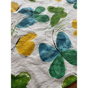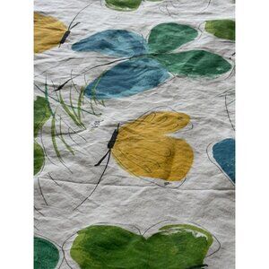 Brighten your dining space with this round cotton tablecloth featuring a vivid butterfly and clover pattern.