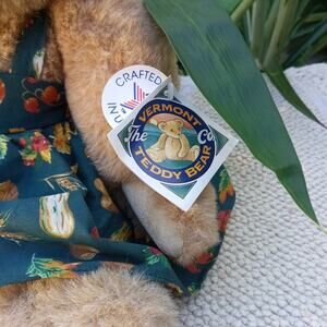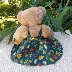 Vintage Vermont Teddy Bear Co. Brown Fuzzy Fur Bear. She is wearing a dark green jumper dress with a Festive Fall Harvest print, removable to clean or change her outfit. Her arms and legs are jointed and rotate 360 degrees. Tag Reads: 1994. A Collectors Piece! And a perfect sweet addition to your Teddy Bear Collection. Excellent Condition.The hang tag is a bit rumpled. Non-Smoking Home. * This pretty girl will ship well protected, safe from the elements in a plastic bag, in a USPS Priority Mail Box, Insured.